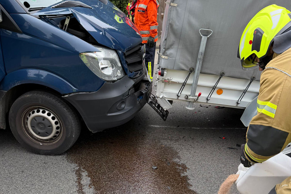 Dort ist ein klein Transporter auf einen PKW mit Anhänger aufgefahren.